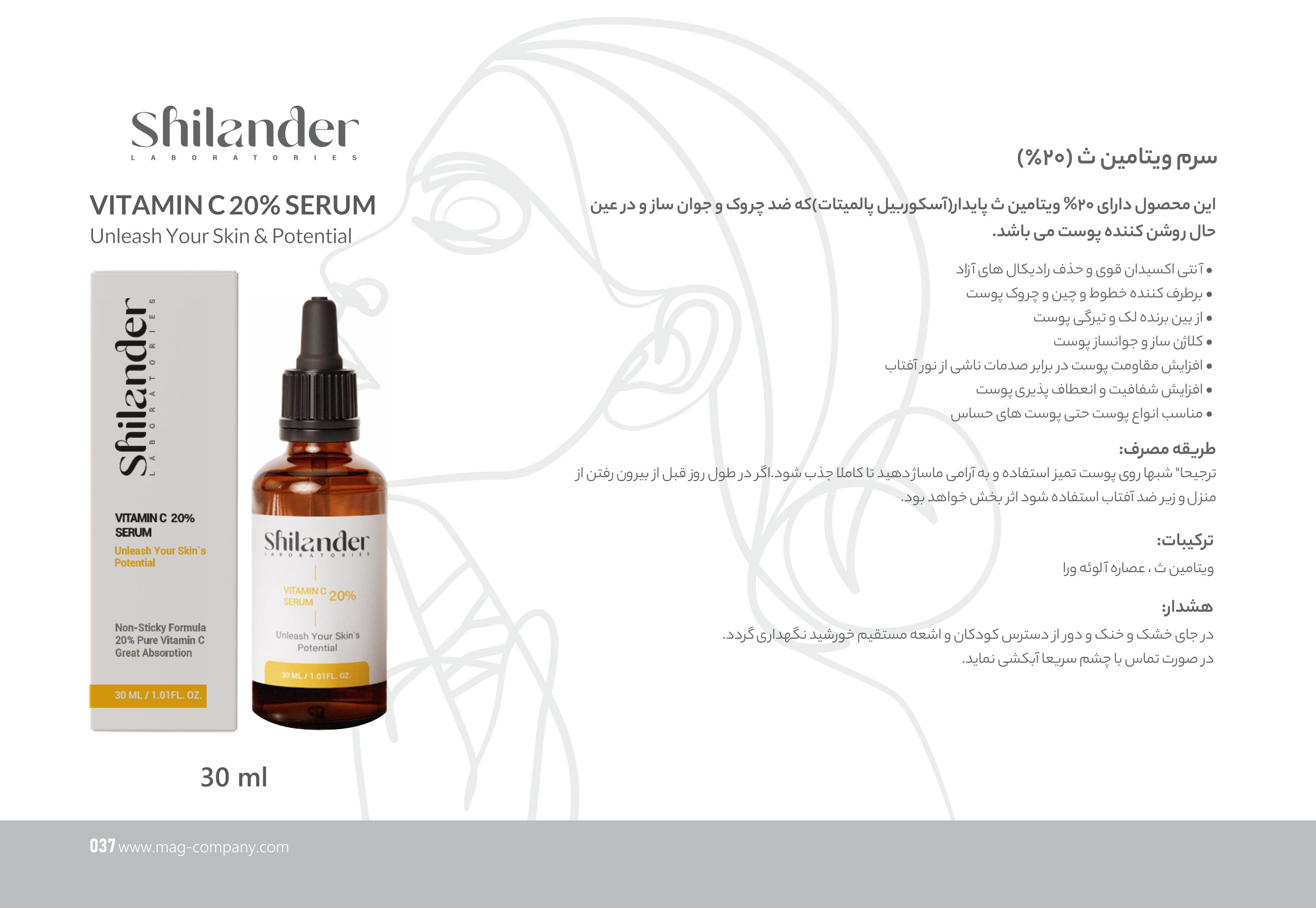 سرم ویتامین C با غلظت 20 درصد به روشن شدن پوست، کاهش لکهای تیره، تحریک تولید کلاژن، و کاهش علائم پیری کمک میکند. همچنین، خاصیت آنتیاکسیدانی قوی آن از پوست در برابر آسیبهای ناشی از رادیکالهای آزاد محافظت میکند.